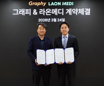 라온메디 김일훈 부사장(왼쪽)과 그래피 박성현 상무가 계약 체결후 기념촬영을 하고 있다. [사진=라온메디] |