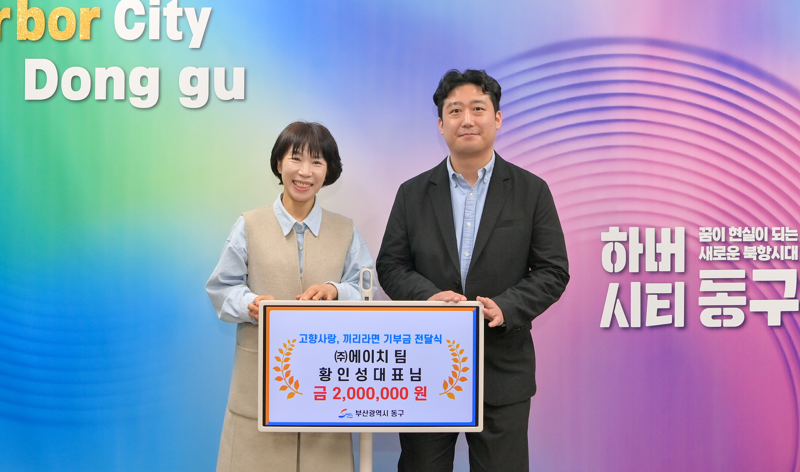 황인성 ㈜에이치팀 대표(오른쪽)가 기부금 전달식에서 기념촬영하고 있다. 동구 제공 |