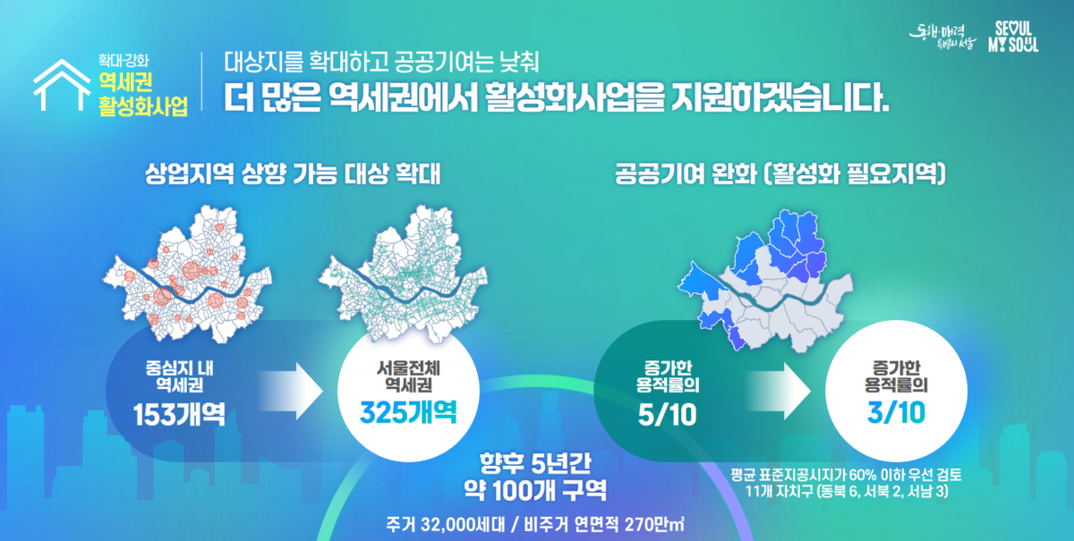 서울시가 153개 역에서만 가능했던 상업지역 용도지역 상향을 전체 역세권 325개 역으로 확대해 모든 역세권을 생활거점으로 전환한다. 역세권 중 수요가 몰리는 환승역은 반경 500m 이내에서 일반상업지역 기준으로 용적률을 최대 1300%까지 허용해 대규모 복합거점으로 조성할 계획이다.