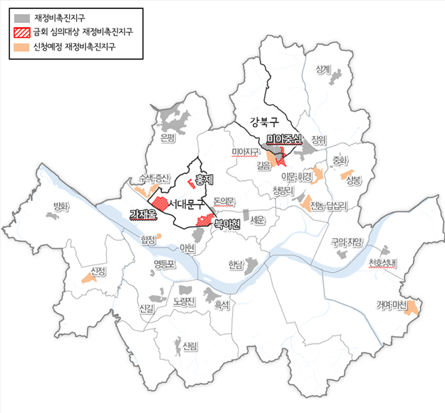 서울시는 지난 24일 제2차 도시재정비위원회를 열고 재정비촉진지구 내 존치관리구역인 미아사거리역 등 5개소에 대해 '재정비촉진계획(존치관리구역 지구단위계획) 결정(변경)(안)'을 수정가결했다고 25일 밝혔다. 해당 구역으로는 △강북구의 미아사거리역 지구단위계획구역 △서대문구의 가재울·북아현·아현·홍제 지구단위계획구역이 대상이다.