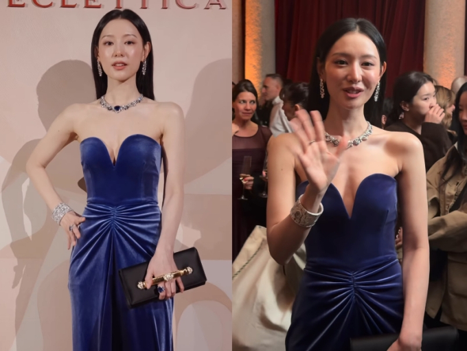 브랜드 앰버서더 자격으로 행사에 참석한 김지원은 가슴선이 드러나는 블루 드레스 차림에 화려한 주얼리를 걸치고 포즈를 취했다.