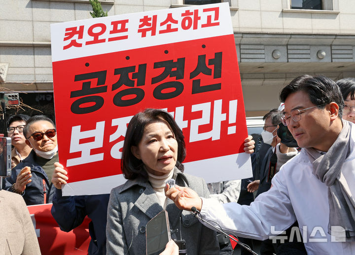 [서울=뉴시스] 김금보 기자 = 지방선거 국민의힘 대구시장 후보에서 컷오프 된 이진숙 전 방송통신위원회 위원장이 24일 오후 서울 여의도 국민의힘 중앙당사 앞에서 지지자들에게 입장을 밝히고 있다. 2026.03.24. kgb@newsis.com |