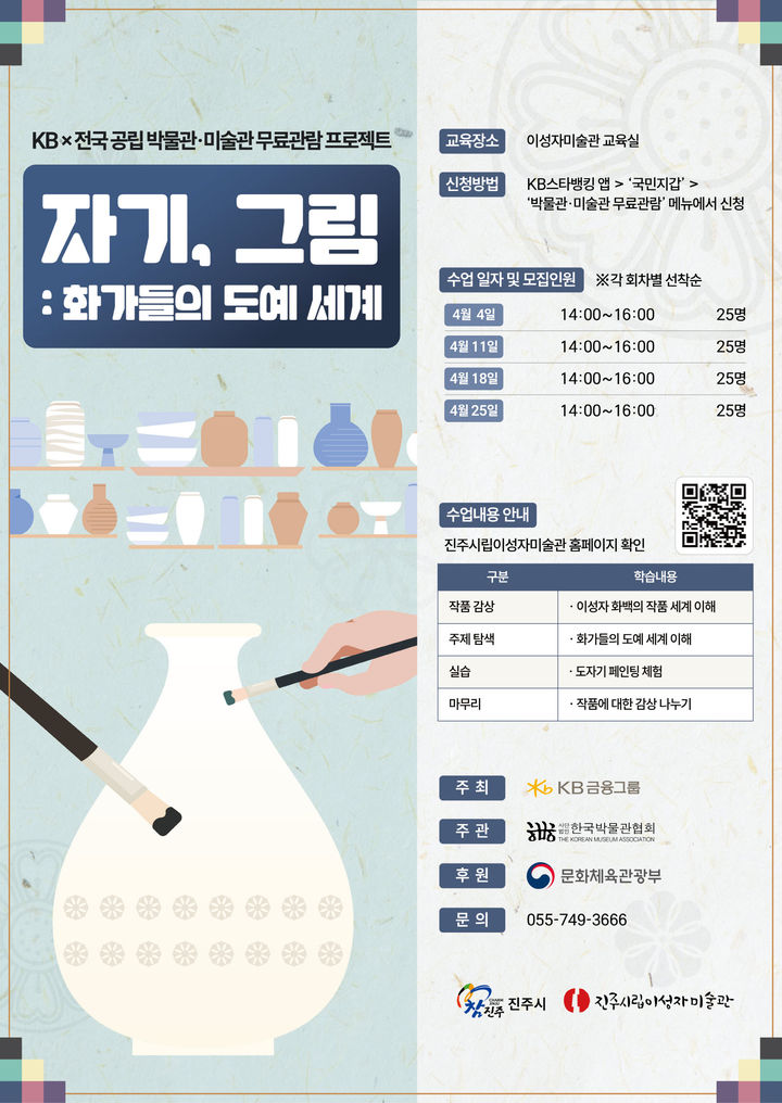 진주시립이성자미술관이 운영하는 프로그램 '자기, 그림'은 초등학생과 동반 가족을 대상으로 하며 화가들의 도예 작업을 중심으로 자기를 조형적 사고와 회화적 표현이 확장된 예술 매체로 이해할 수 있도록 기획됐다.