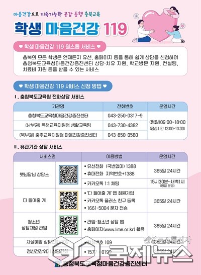 (청주=국제뉴스) 이재기 기자 = 충북도교육청(교육감 윤건영)은 새 학기를 맞아 학생들이 새로운 환경에 안정적으로 적응하고 건강하게 성장할 수 있도록 학생 마음건강 119 서비스를 상시 운영하며 학생 마음건강 지원을 강화하고 있다고 밝혔다.