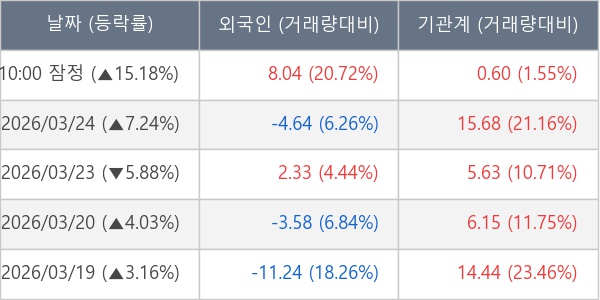 [서울=뉴스핌] 로보뉴스 = 25일 10시 15분 현재 코리아써키트(007810)는 전일 대비 15.18% (현재가 75,100원) 상승했고, 기관이 최근 6일 연속 순매수(누적 61.73만 주, 잠정) 행진을 하고 있다.