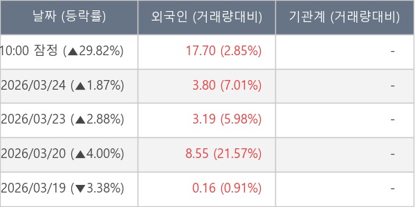 [서울=뉴스핌] 로보뉴스 = 25일 10시 15분 현재 넥스트아이(137940)는 전일 대비 29.82% (현재가 283원) 상승했고, 외국인이 최근 7일 연속 순매수(누적 44.06만 주, 잠정) 행진을 하고 있다.