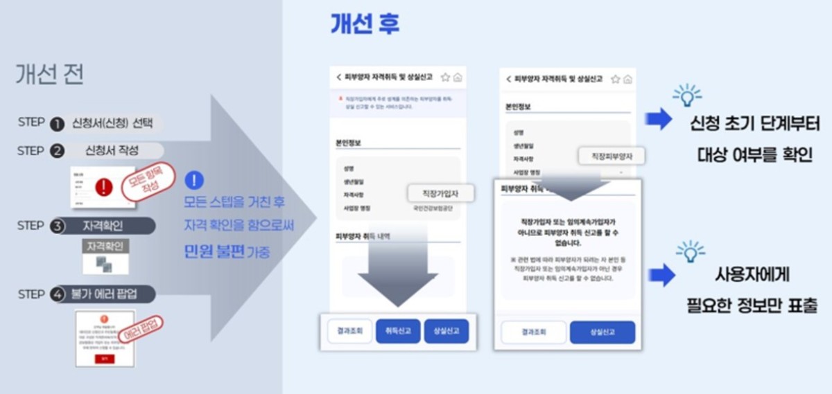 민원 서비스 종류별 메뉴 구조도 개편했다. 기존 '조회', '신청' 등 나열식 기능 구조에서 벗어나 '자격', '보험료 납부' 등 민원 서비스 종류와 이용 목적 중심으로 메뉴를 직관적으로 재구성했다. 자주 찾는 다빈도 민원서비스는 홈 화면 전면에 스크롤 없이 배치해 탐색 과정을 최소화해 단 3번의 터치만으로 원하는 서비스에 빠르게 도달할 수 있다.