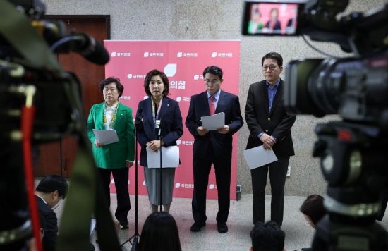 국민의힘 법사위원들이 25일 국회에서 '민주당의 상임위 독식예고 규탄, 법사위원장 야당에 반환 촉구 기자회견'을 하고 있다. 왼쪽부터 조배숙, 나경원, 윤상현, 신동욱 의원.