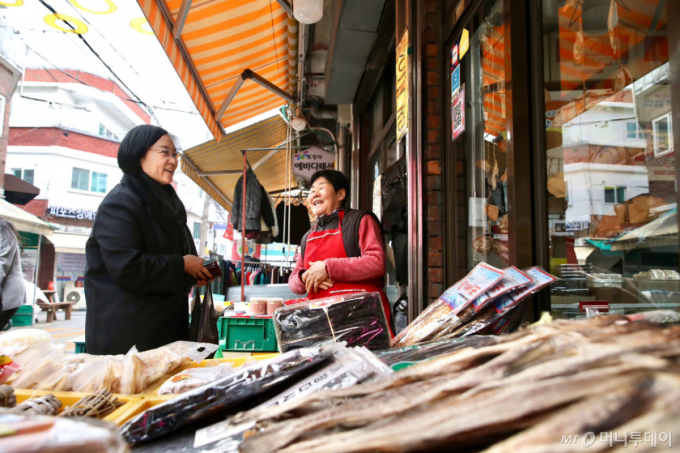 한성숙 중소벤처기업부 장관이 서울 서대문구 포방터시장을 방문해 장을 보며 상인과 대화하고 있다. 기사내용과 무관./사진=뉴스1. |