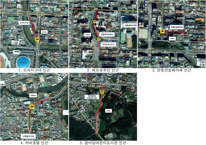 설치 대상지는 ▲오라지구대 인근(서광로) ▲해모로루민 인근(연동4길) ▲연동 한일베라체 인근(사장3길) ▲하버호텔 인근(임항로) ▲꿈바당어린이도서관 인근(연오로)으로 교통 혼잡과 보행자 안전사고 우려가 큰 곳이다.
