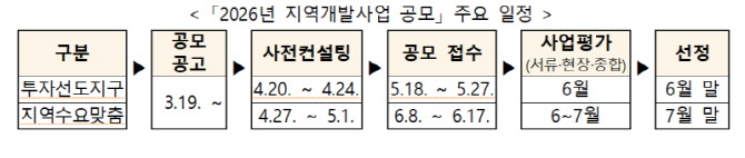 공모에 관한 상세 내용은 지역개발정보시스템에서 확인할 수 있다. 오는 27일 지자체 설명회를 시작으로 사전컨설팅, 서면·현장심사, 종합평가 등을 거쳐 투자선도지구는 6월말에, 지역수요맞춤지원 사업은 7월말에 각각 대상지가 선정될 예정이다.