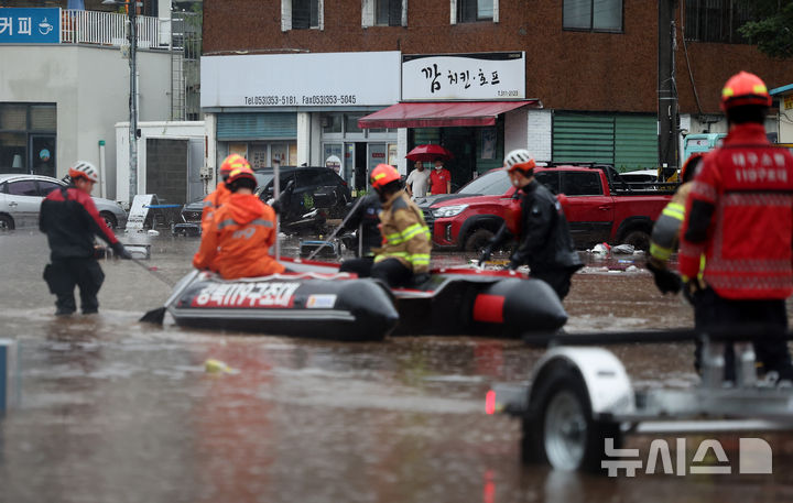 [대구=뉴시스] 이무열 기자 = 17일 대구 북구 노곡동 일대가 집중호우로 인해 물에 잠겨 있다. 2025.07.17. lmy@newsis.com |