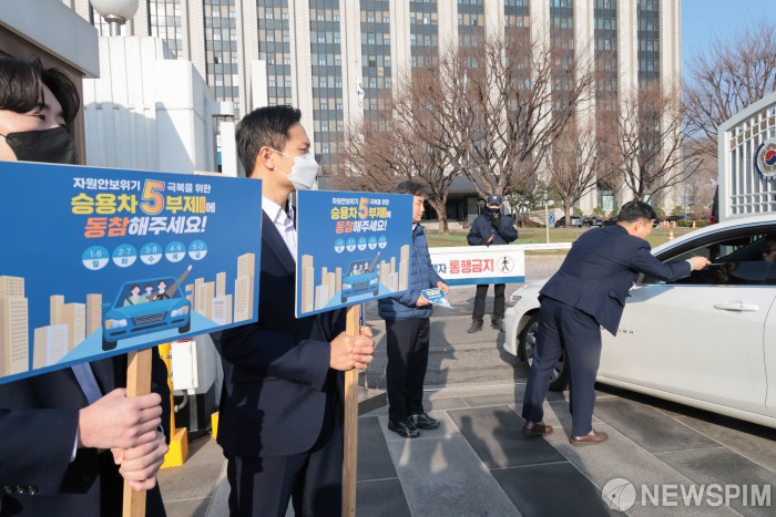 [서울=뉴스핌] 이길동 기자 = 공공부문 승용차 5부제 시행 첫 날인 25일 오전 서울 종로구 정부서울청사 입구에서 정부서울청사 관계자들이 승용차 5부제 동참 캠페인을 하고 있다.공공부문은 선도적으로 에너지절약을 실천하기 위해 25일부터 전기차와 수소차를 제외한 승용차 5부제를 의무적으로 시행한다.2026.03.25 gdlee@newspim.com
