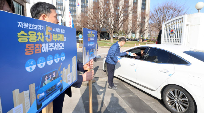 [이데일리 방인권 기자] 공공부문 승용차 5부제(요일제) 의무 시행 첫날인 25일 오전 서울 종로구 정부서울청사에서 청사 관계자들이 5부제 동참 캠페인을 하고 있다. 차량 5부제는 자동차번호판 끝 번호에 따라 요일별로 운행을 제한하는 제도로 끝 번호 1·6번은 월요일, 2·7번은 화요일, 3·8번은 수요일, 4·9번은 목요일, 5·0번은 금요일에 각각 운행이 제한되며 주말과 공휴일은 적용되지 않는다.