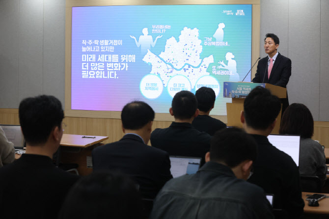 [이데일리 이영훈 기자] 오세훈 서울시장이 25일 오전 서울 중구 서울시청에서 열린 서울 역세권 직·주·락 활성화 전략 기자설명회에서 발표를 하고 있다.