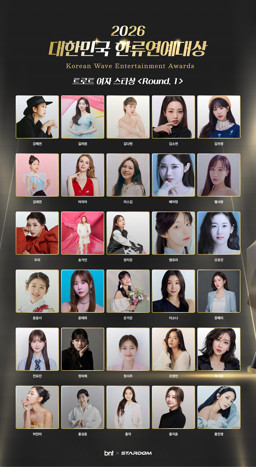 특히 트로트 여자 스타상은 이번 어워즈 내에서도 강력한 팬덤을 보유한 아티스트들이 대거 포진한 핵심 부문으로 꼽힌다. Round 1에는 강혜연, 길려원, 김다현, 김소연, 김의영, 김태연, 마리아, 미스김, 배아현, 별사랑, 두리, 송가인, 양지은, 염유리, 오유진, 윤윤서, 윤태화, 은가은, 이소나, 장혜리, 전유진, 정미애, 정서주, 조정민, 하이량, 허찬미, 홍성윤, 홍자, 홍지윤, 홍진영 등 다양한 아티스트들이 이름을 올리며 폭넓은 경쟁 구도를 형성했다.