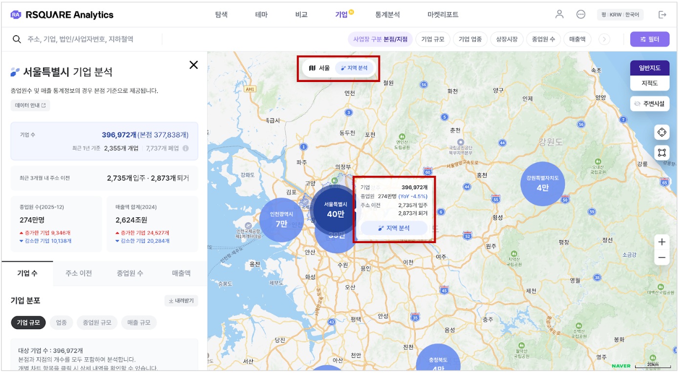 신규 ‘기업’ 메뉴에서는 지도 기반으로 특정 지역을 설정해 기업 분포와 업종 구성, 매출 규모 및 성장률, 종업원 수 변화, 본사 이전 흐름 등을 확인할 수 있다. 이를 통해 기업 활동과 부동산 시장 간 연관성을 보다 입체적으로 분석할 수 있게 됐다.
