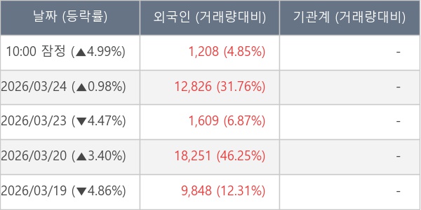 [서울=뉴스핌] 로보뉴스 = 25일 10시 15분 현재 케이쓰리아이(431190)는 전일 대비 4.99% (현재가 4,310원) 상승했고, 외국인이 최근 5일 연속 순매수(누적 43,742주, 잠정) 행진을 하고 있다.