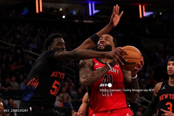 (미국=국제뉴스) 이기철 기자 = 24일(현지시간) 미국 뉴욕 매디슨 스퀘어 가든에서 열린 뉴올리언스 펠리컨스와 뉴욕 닉스의 2025~2026시즌 미국프로농구(NBA) 정규리그 4쿼터, 뉴올리언스의 사딕 베이(41번)가 닉스의 모하메드 디와라(51번)를 상대로 돌파를 시도하고 있다.