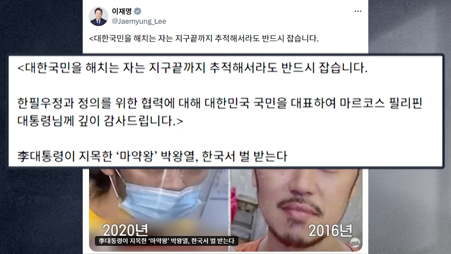 이 대통령은 오늘(25일) 자신의 SNS에 박 씨의 송환을 다룬 기사를 공유하면서 "이번 조치는 어떠한 범죄도 국경을 넘어 책임을 피할 수 없다는 원칙을 분명히 한 것"이라고 설명했습니다.