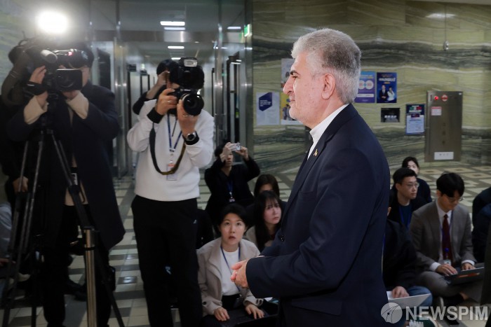 [서울=뉴스핌] 정일구 기자 = 사이드 쿠제치 주한 이란대사가 25일 오전 서울 여의도 국회에서 외교통일위원장인 김석기 국민의힘 의원과 면담하기 위해 외통위 소회의실로 향하고 있다. 2026.03.25 mironj19@newspim.com
