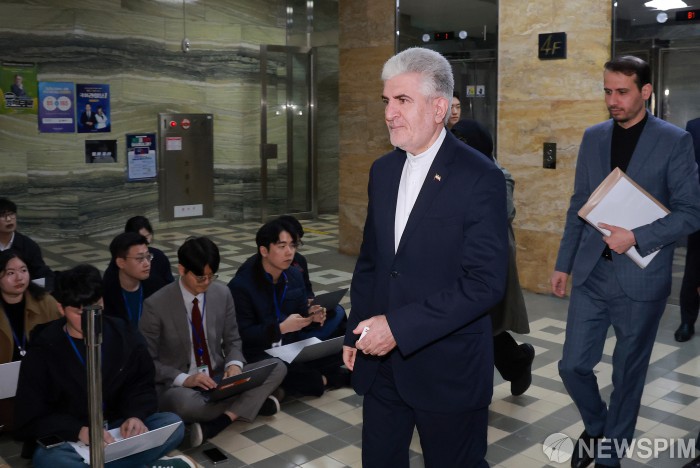 [서울=뉴스핌] 정일구 기자 = 사이드 쿠제치 주한 이란대사가 25일 오전 서울 여의도 국회에서 외교통일위원장인 김석기 국민의힘 의원과 면담하기 위해 외통위 소회의실로 향하고 있다. 2026.03.25 mironj19@newspim.com