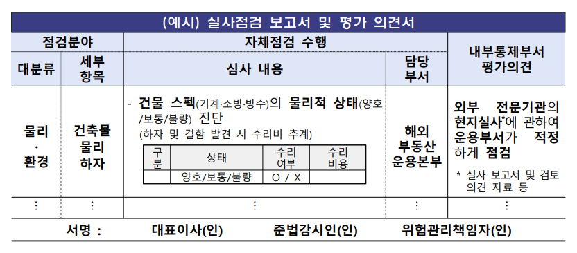개정안에 따르면 운용사는 외부 전문업체가 실시한 현지실사에 관해 자체적으로 점검 등을 수행하고 내부통제부서가 이에 대한 평가의견을 작성해야 한다. 기재 사항은 최종적으로 대표이사, 준법감시인, 위험관리책임자 등의 서명을 받아야 한다.