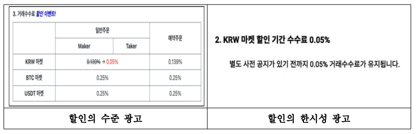 하지만 공정위 조사 결과 두나무는 일반 주문에 대해 0.139%라는 수수료율을 단 한 번도 적용한 적이 없었다. 수수료율이 대폭 할인되는 것처럼 광고했지만 애초에 정가가 0.05%였다는 의미다.