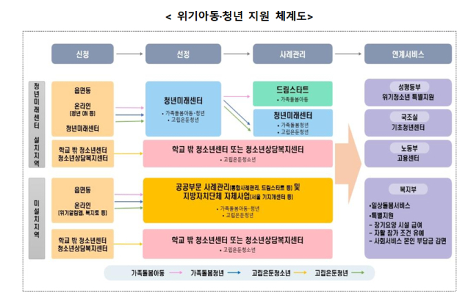대상자 발굴 방식도 개선된다. 기존에는 가족돌봄, 고립은둔의 어려움이 있는 대상자가 직접 지원을 신청해야 했지만 앞으로는 본인 뿐만 아니라 교사, 복지시설 종사자 등 관계자가 도움이 필요하다고 판단할 경우 지원을 요청할 수 있다. 내년부터는 공공데이터를 활용한 위기군 조기발굴 시스템을 도입해 위기아동·청년을 선제적으로 찾아내는 체계를 구축할 예정이다.