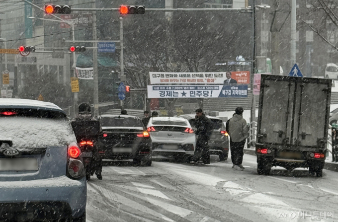 (대구=뉴스1) 공정식 기자 = 밤사이 많은 눈이 내린 2일 오전 대구 북구 경북대 인근에서 눈길 교통사고가 발생했다. 2026.2.2/뉴스1 Copyright (C) 뉴스1. All rights reserved. 무단 전재 및 재배포, AI학습 이용 금지. /사진=(대구=뉴스1) 공정식 기자 |