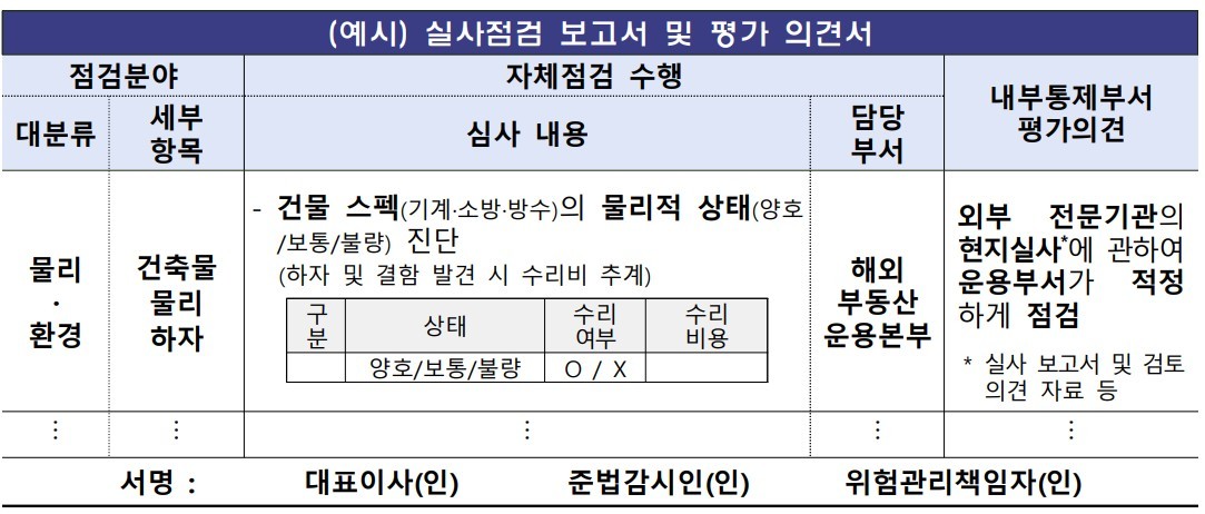 자산운용사는 외부 전문업체가 실시한 현지 실사를 토대로 자체 서면 점검을 수행해야 하며, 내부통제부서가 이에 대한 평가 의견을 별도로 작성해야 하는데, 이 모든 내용에 대표이사, 준법감시인, 위험관리책임자 3인의 서명을 받도록 의무화했다.