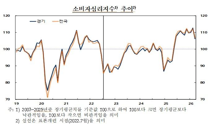 25일 한국은행 경기본부가 발표한 올해 3월 경기지역 소비자동향조사 결과에 따르면 소비자심리지수(CCSI)는 106.2로 전월 대비 6.5p 하락했다. 전국 소비자심리지수는 107이다.