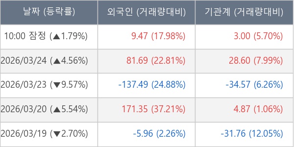 [서울=뉴스핌] 로보뉴스 = 25일 10시 15분 현재 팬오션(028670)은 외국인과 기관이 각각 9.47 만 주, 3.00 만 주 순매수(잠정) 하면서 전일 대비 1.79% (현재가 5,130원) 상승하고 있다.
