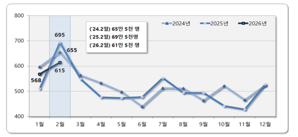 25일 국가데이터처의 '2026년 2월 국내 인구이동 통계'에 따르면 지난달 국내 인구이동자 수는 61만5000명으로 지난해 같은 달보다 8만명(11.5%) 감소했다.