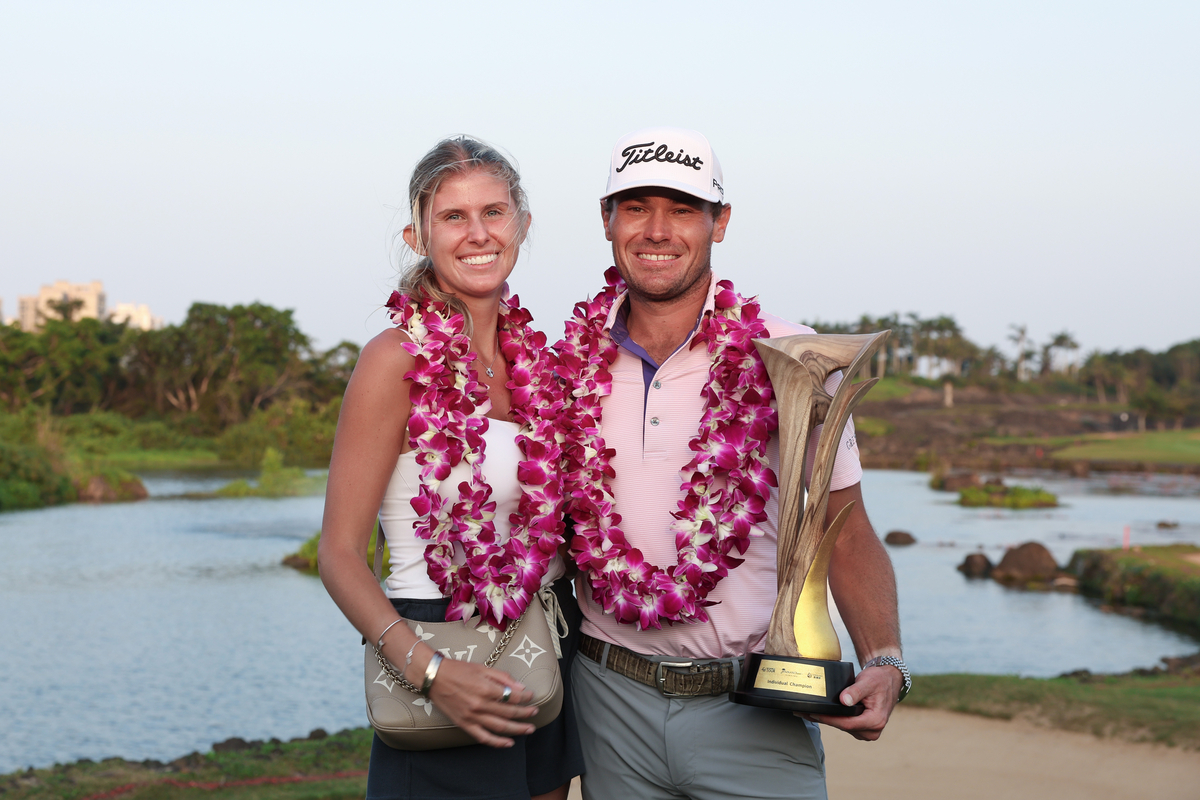 조던 검버그가 지난 22일 끝난 DP월드 투어 하이난 클래식에서 우승한 뒤 트로피를 들고 아내와 함께 기념촬영을 하고 있다. 게티이미지코리아 |