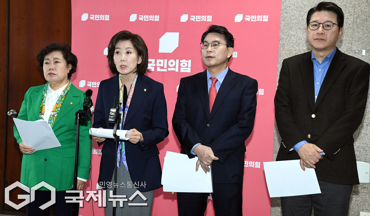 (서울=국제뉴스) 국회 법사위 국민의힘 조배숙(왼쪽부터), 나경원, 윤상현, 신동욱 의원이 25일 오전 서울 여의도 국회에서 '민주당의 상임위 독식예고 규탄, 법사위원장 야당에 반환촉구 기자회견' 을 하고 있다./사진=이용우 기자