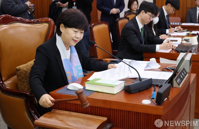 [서울=뉴스핌] 정일구 기자 = 25일 오전 서울 여의도 국회에서 열린 윤석열 정권 정치검찰 조작기소 의혹 사건 진상규명 국정조사특별위원회 제2차 전체회의에서 서영교 위원장이 의사봉을 두드리고 있다. 2026.03.25 mironj19@newspim.com