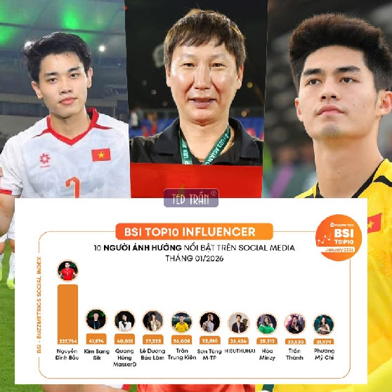 김상식 감독의 매니지먼트사인 디제이매니지먼트는 “베트남 소셜 데이터 분석 기업 버즈메트릭스(Buzzmetrics)가 발표한 ‘2026년 1월 BSI(소셜미디어 영향력 지수) 랭킹’에서 김 감독이 전체 2위를 기록했다”고 25일 전했다. 이는 연예인과 인플루언서, 스포츠 스타를 모두 포함한 통합 순위다.