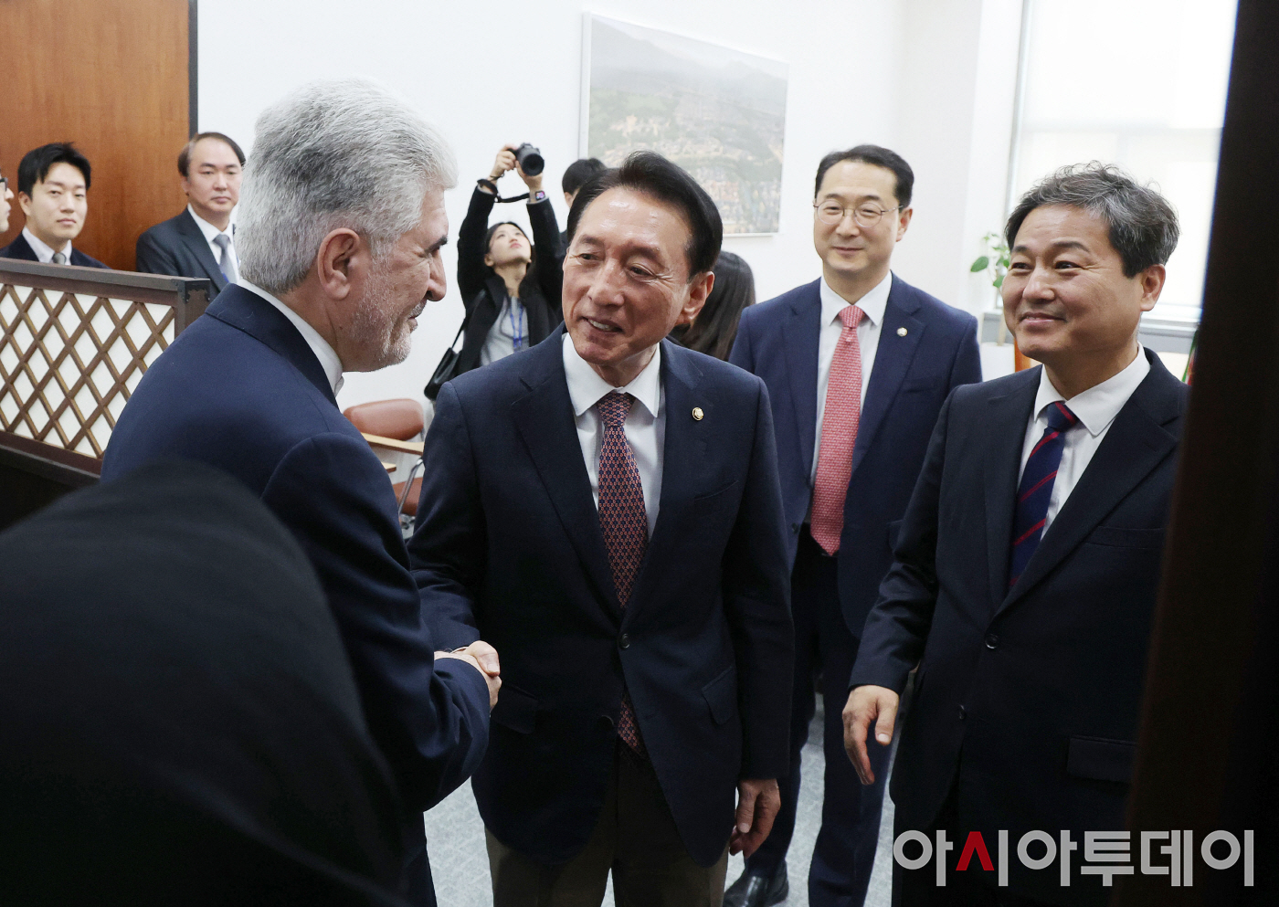 아시아투데이 이병화 기자 = 사이드 쿠제치 주한 이란대사가 25일 국회에서 김석기 국회 외교통일위원장, 김영배 더불어민주당 간사·김건 국민의힘 간사와 인사하고 있다.
