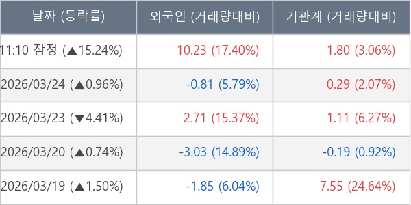 [서울=뉴스핌] 로보뉴스 = 25일 11시 30분 현재 한양디지텍(078350)은 외국인과 기관이 각각 10.23 만 주, 1.80 만 주 순매수(잠정) 하면서 전일 대비 15.24% (현재가 30,250원) 상승하고 있다.