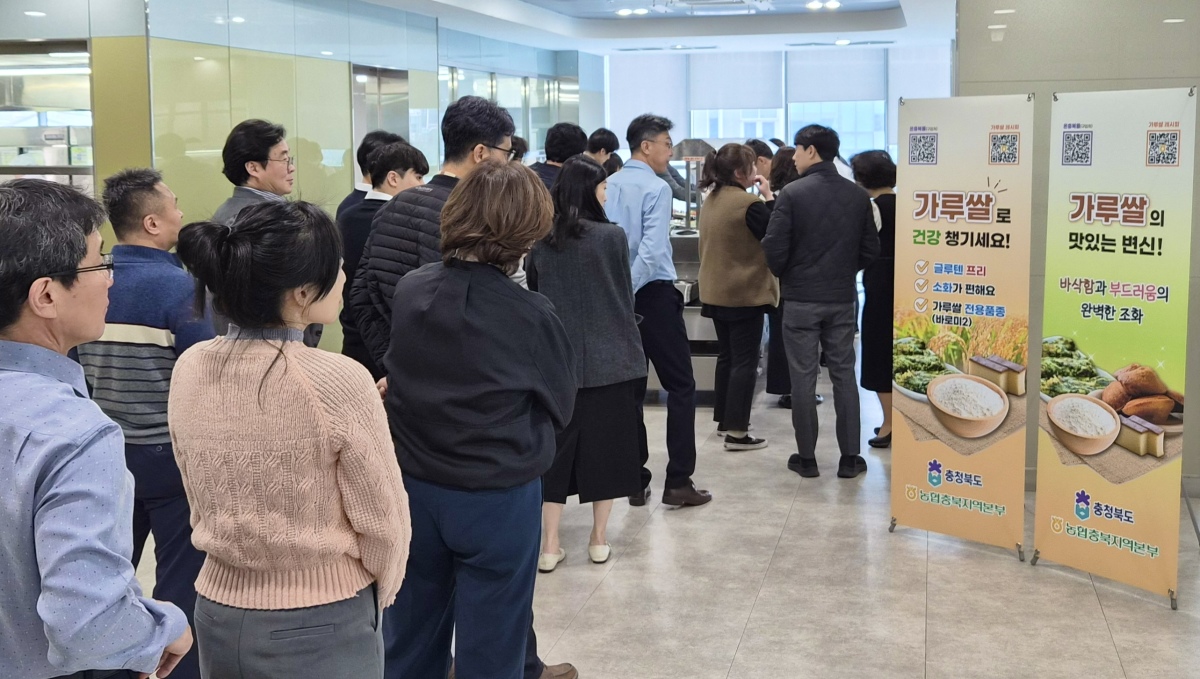 충북농협은 25일 구내식당에서 수안보농협이 생산한 가루쌀을 활용한 메뉴를 선보이며 직원들을 대상으로 소비촉진 활동을 펼쳤다.