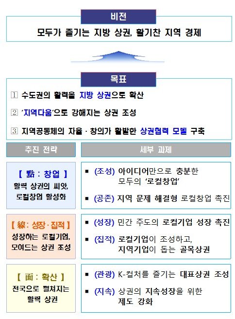 이에 정부는 지방 특색을 보유한 모두의 지역 상권을 구현하기 위해 상권의 점(창업)·선(성장)·면(확산)을 중심으로 한 지원 전략을 수립했다.