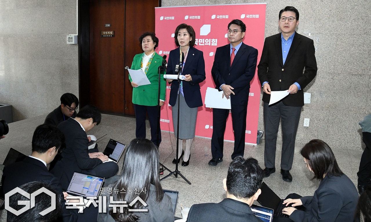 (서울=국제뉴스) 국회 법사위 국민의힘 조배숙(왼쪽부터), 나경원, 윤상현, 신동욱 의원이 25일 오전 서울 여의도 국회에서 '민주당의 상임위 독식예고 규탄, 법사위원장 야당에 반환촉구 기자회견' 을 하고 있다./사진=이용우 기자