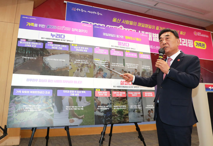 [울산=뉴시스] 유재형 기자 = 울산시는 25일 시청 본관 3층 프레스센터에서 청년과 여성, 어르신에 이어 ‘가족’을 핵심으로 한 세대별 맞춤형 복지 정책을 발표했다.
