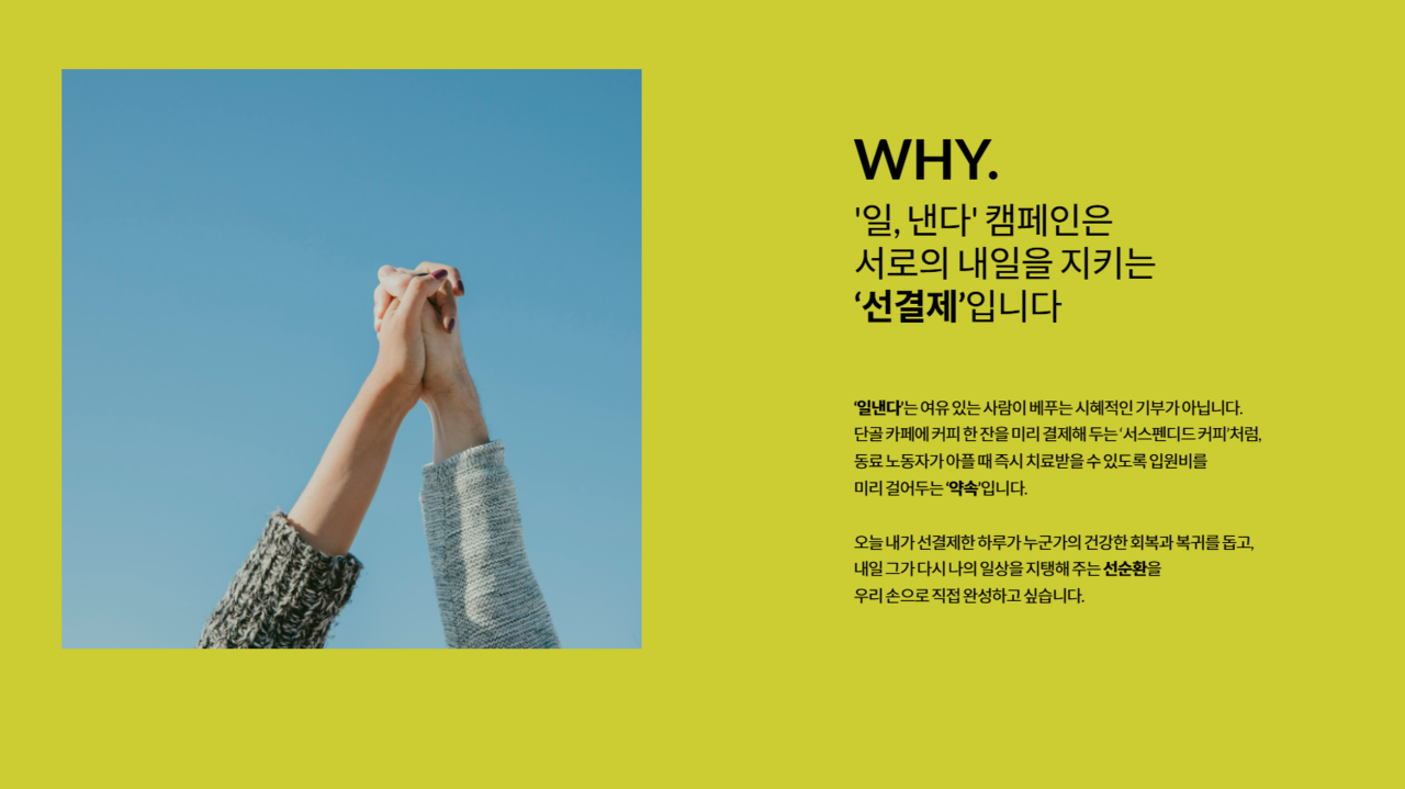 캠페인명인 ‘일, 낸다’에는 4가지 다각적인 의미가 담겼다. △아픈 동료를 위해 나의 ‘하루(日)’를 기꺼이 내어준다는 마음 △가장 작은 ‘하나(1)’의 손길이 모여 큰 변화를 만든다는 믿음 △전태일의 정신이자 우리 일터의 ‘노동(Work)’을 존중하는 태도 △평범한 시민들이 힘을 모아 기적 같은 ‘일(사건·Event)’을 낸다는 역동성을 뜻한다.