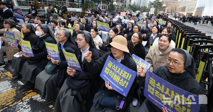 [서울=뉴시스] 김선웅 기자 = 25일 서울 종로구 옛 주한 일본대사관 인근 평화의 소녀상 앞에서 열린 제1745차 일본군 성노예제 문제해결을 위한 수요시위에서 참가자들이 일본의 사죄와 배상을 촉구하고 있다. 2026.03.25. mangusta@newsis.com
