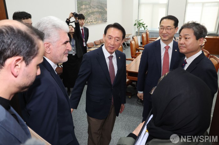 [서울=뉴스핌] 정일구 기자 = 사이드 쿠제치 주한 이란대사가 25일 오전 서울 여의도 국회에서 외교통일위원장인 김석기 국민의힘 의원, 여야 간사인 김영배 더불어민주당 의원, 김건 국민의힘 의원과 인사하고 있다. 2026.03.25 mironj19@newspim.com