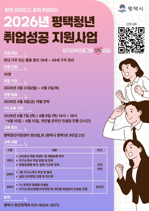 모집 대상은 평택시 거주 또는 활동 중인 구직 청년(19~39세) 10명이며, 신청은 모집 포스터의 QR코드 접속을 통해 가능하다. 선정 결과는 4월 3일 개별 통보된다.