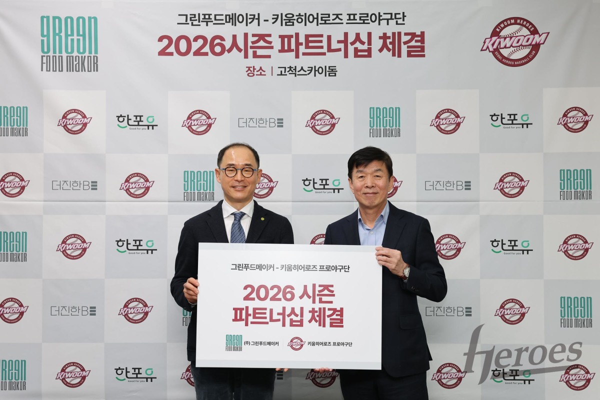 [서울=뉴스핌] 한지용 인턴기자 = 프로야구 키움 히어로즈가 지난 23일 건강기능 식품 브랜드 '그린푸드메이커'와 2026시즌 파트너십 계약을 맺었다. [사진=키움 히어로즈] 2026.03.25 football1229@newspim.com |