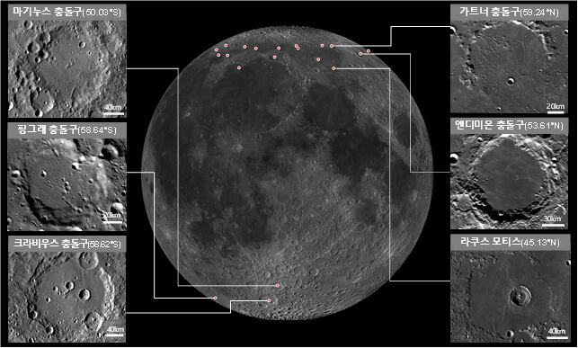 위도 40~70도 범위 내 달 착륙지 후보 지역 예시. 우주항공청은 위의 지역을 포함한 남·북반구 약 30여개 후보 지역을 상세 분석해 착륙지를 선정할 예정이다./우주항공청 |
